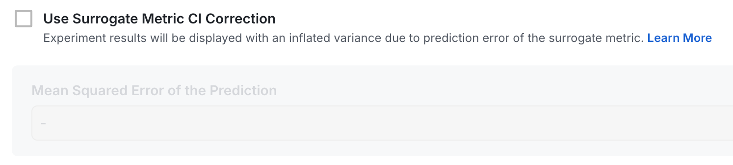 Statsig doesn’t create surrogate metrics for you, we’re relying on you generating unit level data based on a model that you create and maintain. When you create a surrogate metric, you’ll be able to input the mean squared error (MSE) of your model, so that we can accurately account for the error associated with the prediction.