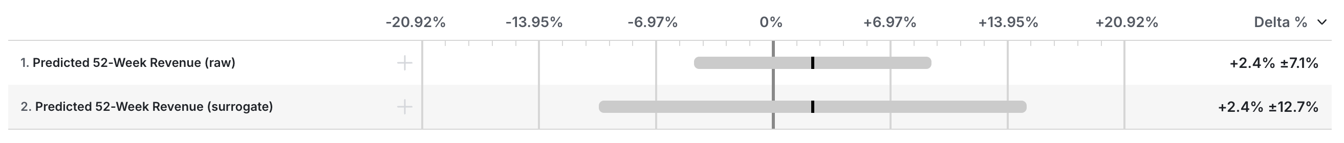 Experiment results for surrogate metrics will display a confidence interval that takes into account both the variance observed among units in the different variants of the experiment, but also the error associated with the prediction.
