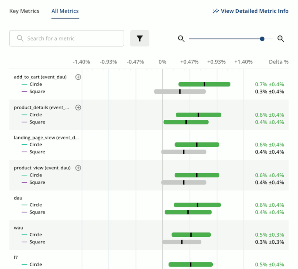 Finally, you can view a snapshot of the metrics of interest that have shifted in the experiment with their statistical significance. This provides valuable information at a glance as shown below, illustrating the experiment's performance.