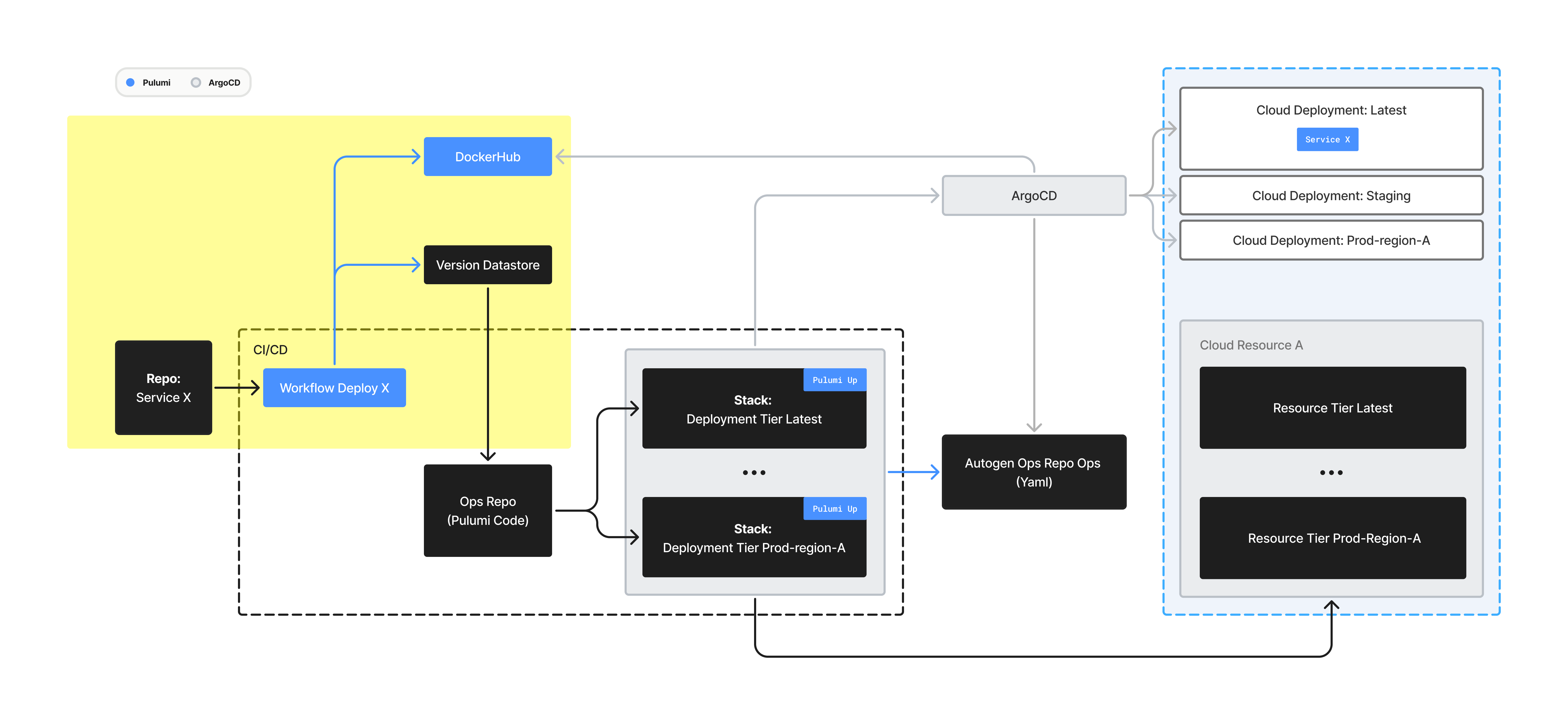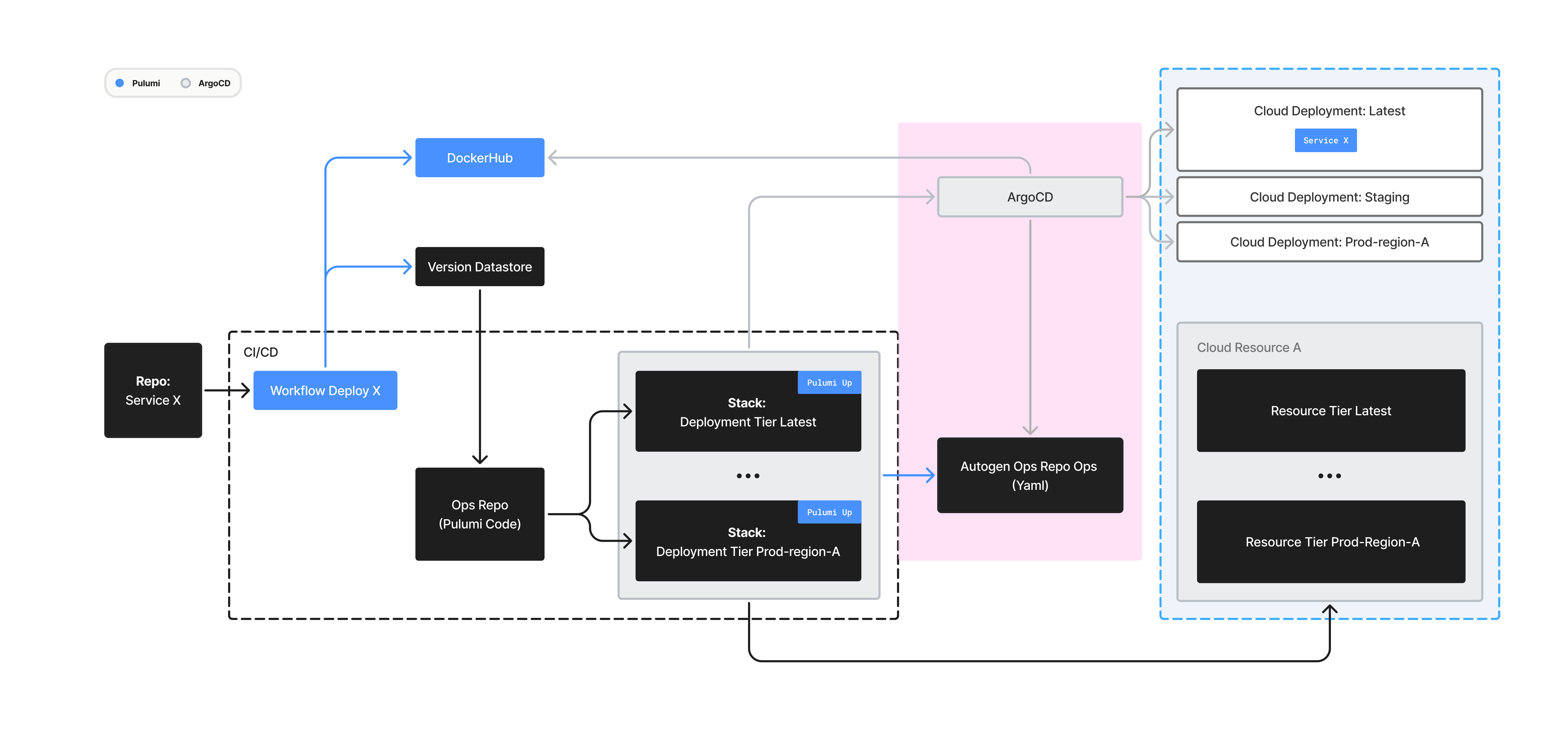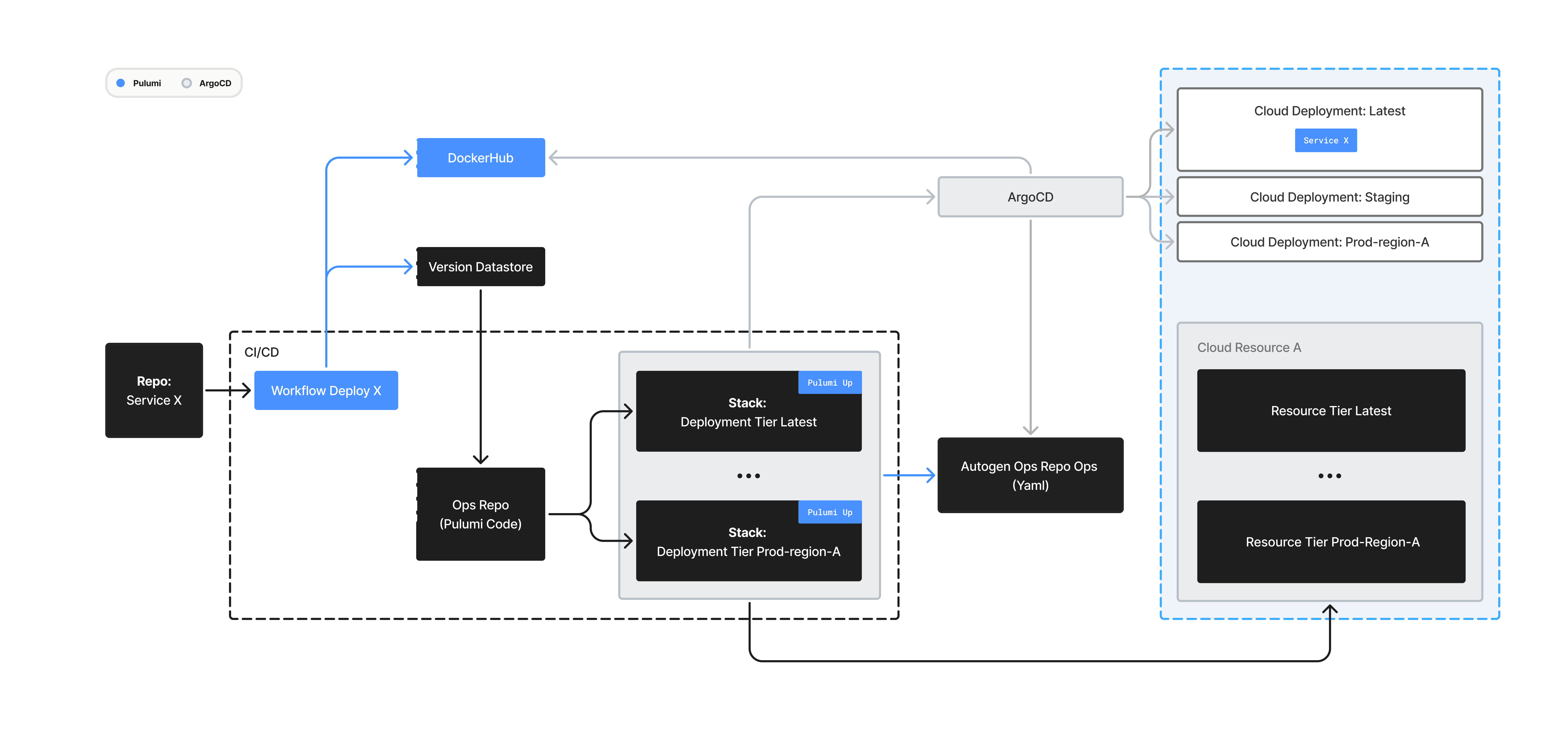4. Pulumi runs multiple stacks in parallel (e.g., Latest, Staging, Prod-region-A). Each stack aligns the live state of cloud resources (Kubernetes clusters, networks, datastores) with the state specified by the Pulumi code in our OPS repo. The stacks pull the image binary tag from Version Datastore and auto-generates Kubernetes manifests into the Autogen Ops Repo.