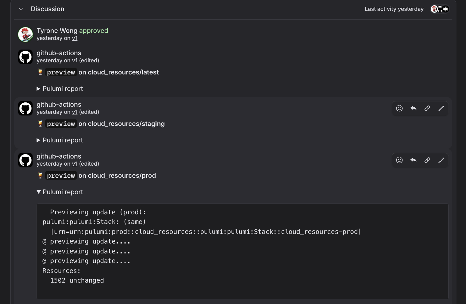 Another nice tool is that in the Discussion Area, your PR automatically gets marked with Previews for cloud resources so you can see what the CI/CD will do if you merge your PR in. This gives developers visibility into their changes without having to check it in. From this screenshot, for example, I know that this diff I'm checking in will leave prod resources completely untouched:
