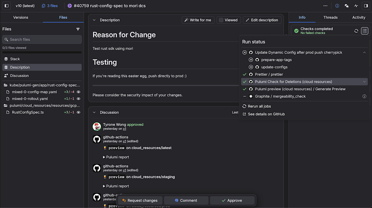Lastly, on the right, we have automated actions running for each PR to check builds. We also have this action that checks for deletions and, if there are any, it marks your PR with a warning to give a heads up to engineers about unintended behavior. Cloud resources leverage Pulumi’s protection flag so even if the code gets checked in, deletion will not happen unless manual action is taken, as shown in the description: