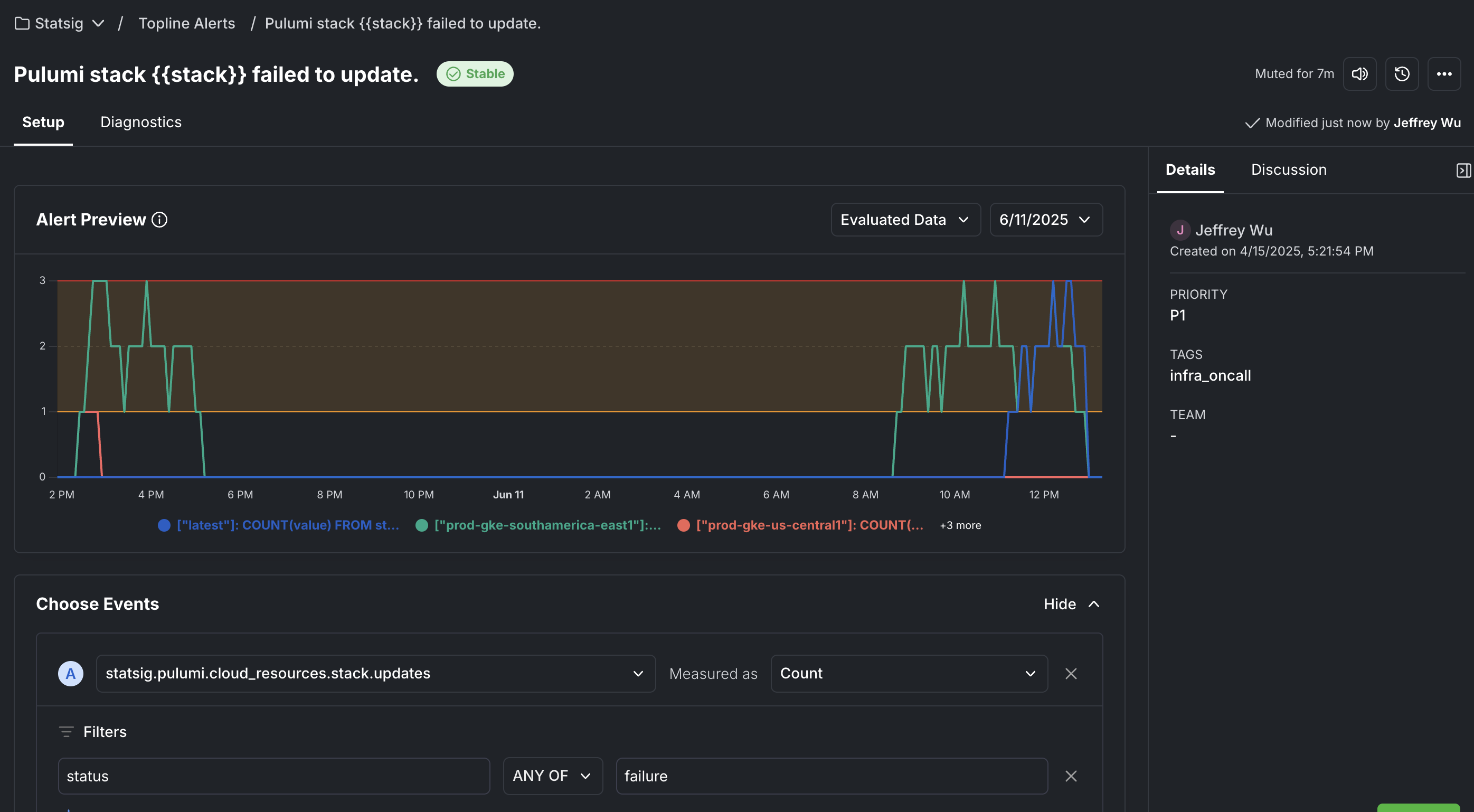 We also have guardrails set up for the worst case scenarios. If undesirable code does get checked in and there is an error, or if some of the resources are almost deleted (we set up protections so that they'll throw an error in the run), we have metrics and Topline Alerts powered by Statsig. When the stack tries to run and fails, we keep track of metrics: